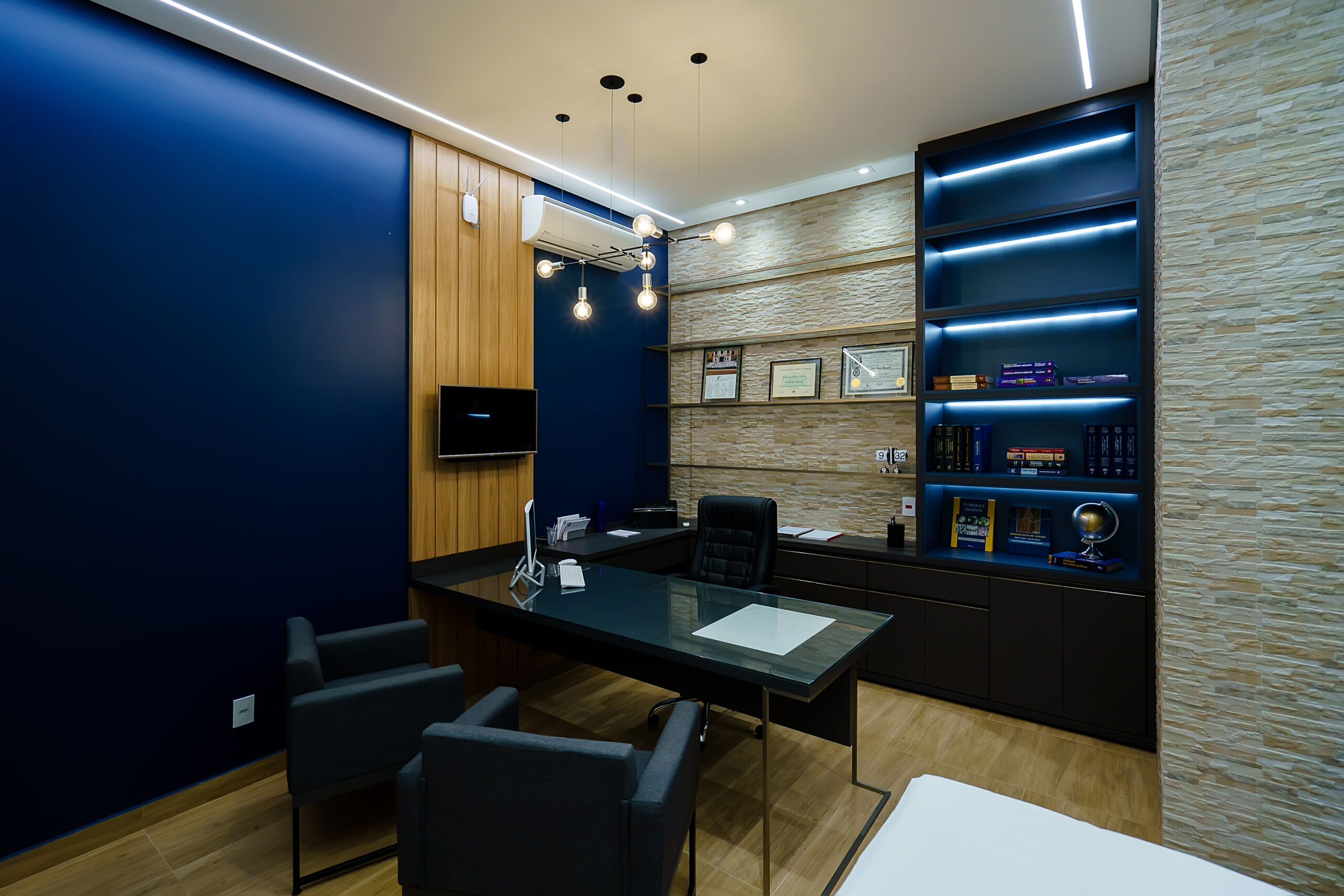 Os perfis de LED estrategicamente posicionados ao redor da sala, oferecem uma iluminação geral suave e uniforme, criando um ambiente acolhedor e clinicamente eficaz. Em suma, essa abordagem cuidadosa garante visibilidade adequada para procedimentos. Além disso, também contribui para a sensação de conforto que é essencial em um consultório médico.